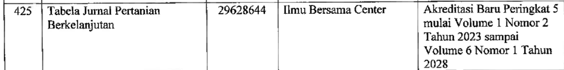 Pemberitahuan hasil akreditasi jurnal ilmiah menyatakan Tabela Jurnal Pertanian Berkelajutan berhasil meraih akreditasi peringkat 5 (SINTA 5) mulai Volume 1 Nomor 2 Tahun 2023 sampai Volume 6 Nomor 1 Tahun 2028 informasi selengkapnya dapat dilihat pada pranala berikut: